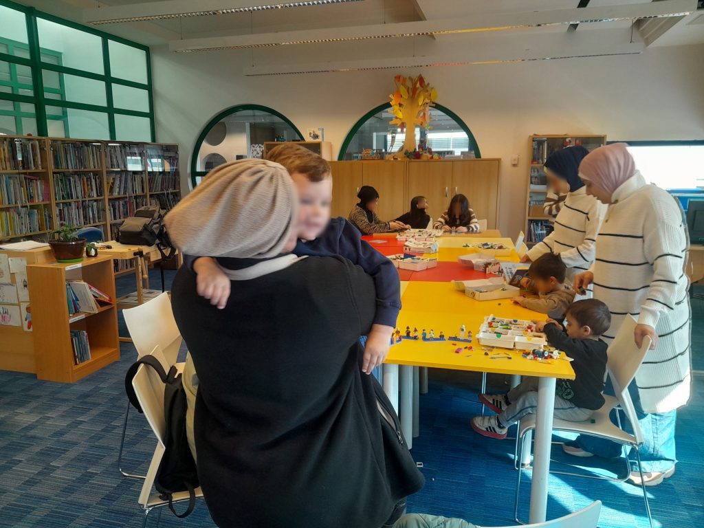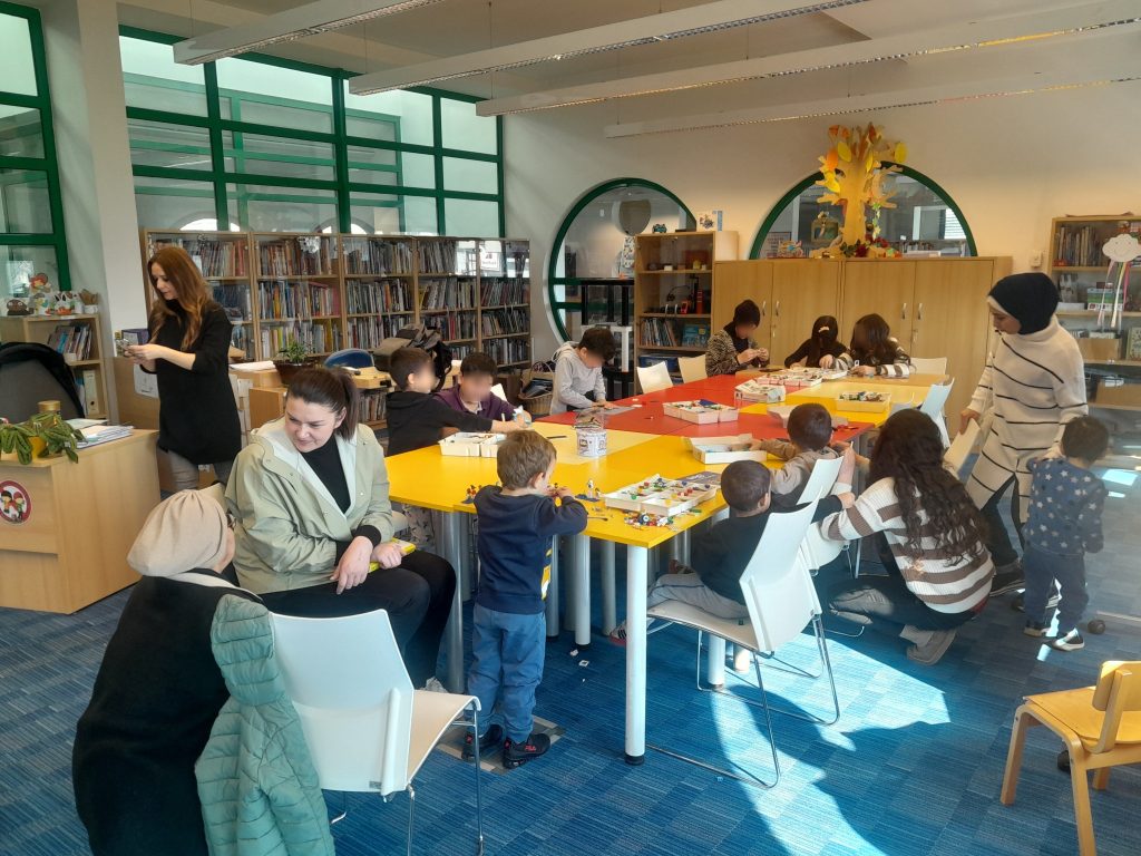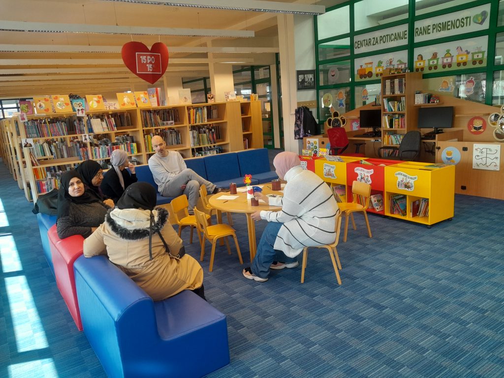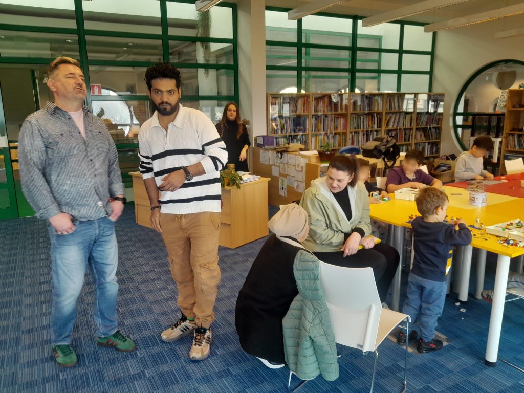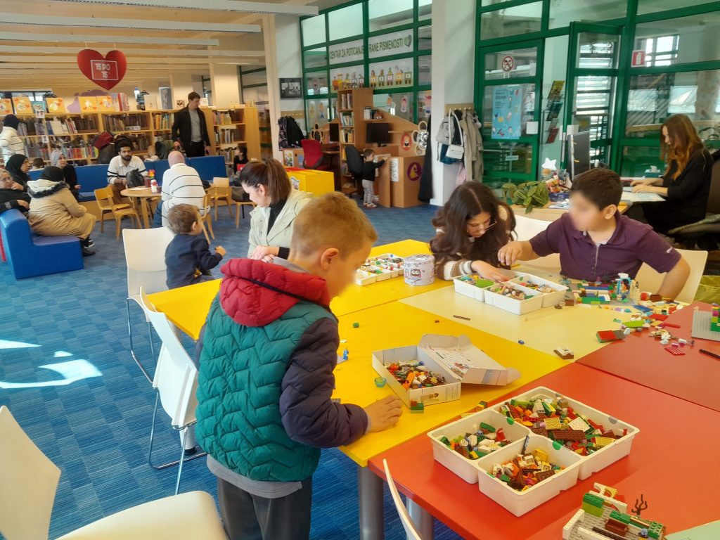 U knjižnici su djeca sklapala figure od lego kocki, a odrasli su se družili sa zaposlenicima knjižnice i mještanima. Kroz ovu I slične aktivnosti bila nam je namjera aktivno djelovati na proces integracije kroz uključivanje i povezivanje pripadnika ove populacije u život zajednice.
